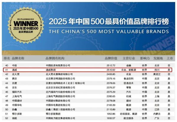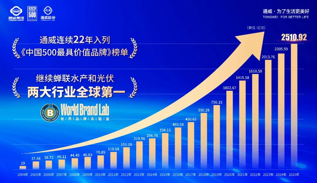 2025年,通威品牌价值再创历史新高,达到2510.92亿元,排名第41位,品牌价值比去年增加205.33亿元,并与五粮液、长虹共同荣列四川企业最具有价值品牌前三,继续保持水产和光伏两大行业品牌价值全球第一的领先优势。