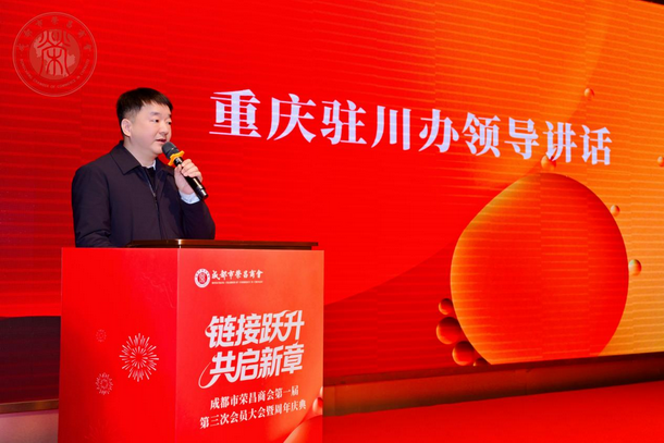 庆典现场,成都市工商联党组成员、副主席盛成皿作为主办单位的主管部门领导首先讲话,对成都市荣昌商会周年庆典的召开表示祝贺,高度肯定了商会在党建引领、会员建设、服务提质、两地联动等方面,作为新生商会的蓬勃活力与扎实成效。